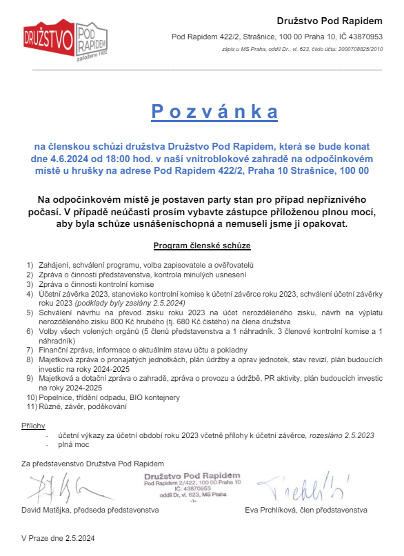 Pozvánka na členskou schůzi družstva Družstvo Pod Rapidem, která se bude konatdne 29.5.2025 od 18:00 hod. v naší vnitroblokové zahradě na odpočinkovém místě u hrušky na adrese Pod Rapidem 422/2, Praha 10 Strašnice, 100 00