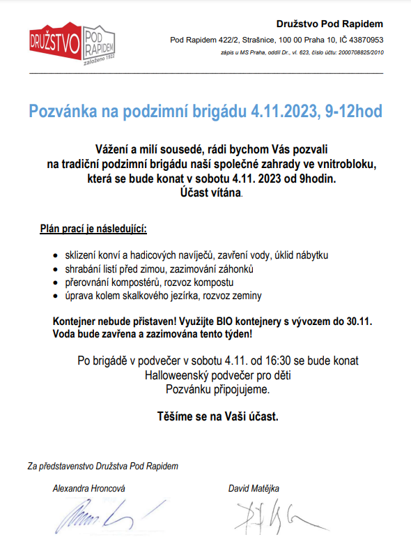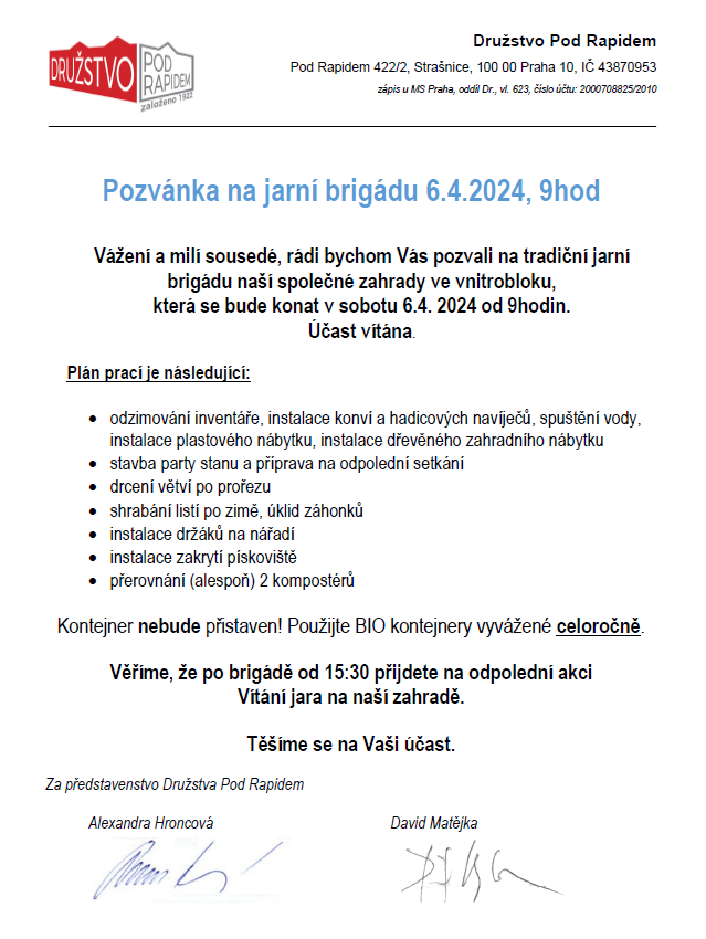 Díky podpoře a dotaci od Městské části Praha 10 se nám podařilo opět výrazně zvelebit naši zahradu. Získané prostředky jsme využili na obnovu půdy, kterou jsme obohatili o kompost tak, aby lépe prospívala rostlinám a celému ekosystému zahrady. Dále jsme nechali provést profesionální a odborný ořez stromů, čímž jsme nejen zlepšili jejich zdravotní stav, ale i zvýšili bezpečnost a estetiku celého prostoru. V neposlední řadě jsme pořídili nové zahradní náčiní a vysadili nové rostliny, které obohatí zahradu o další barvy, vůně a biodiverzitu.