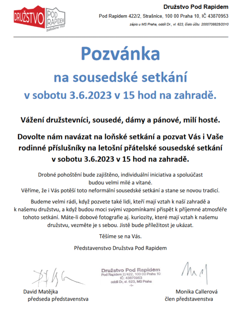 Moc děkuji všem, kteří pomohli s přípravou a organizací a všem, kteří přišli na toto setkání. Příští tradiční sousedské setkání bude začátkem června 2024.
